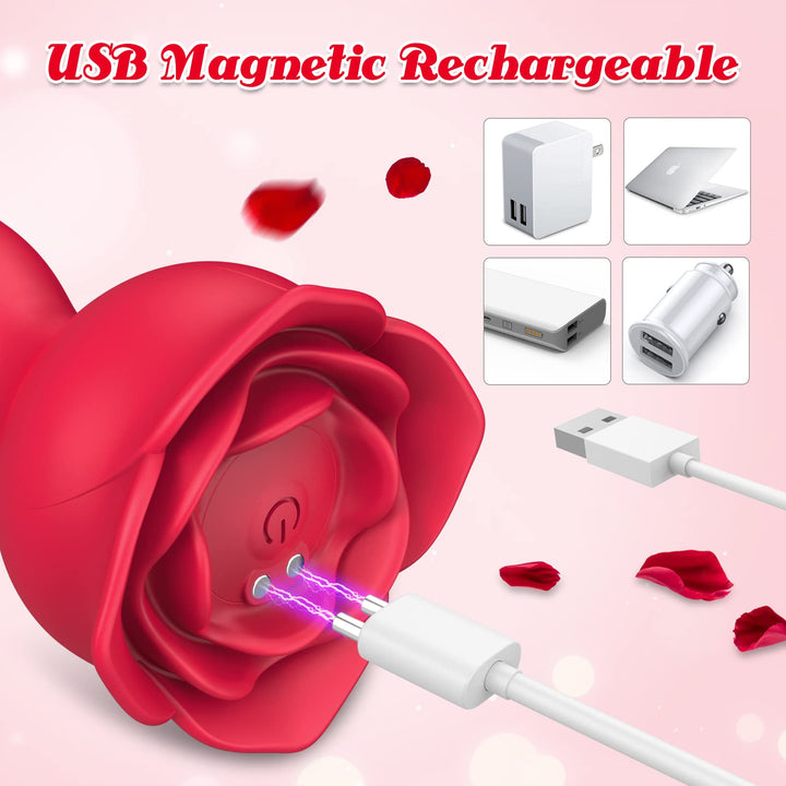 - USB Magnetic Rechargeable & Waterproof. This rose stimulator for women is USB magnetic rechargeable, which can improve the charging efficiency as well as product battery life. And this rose toy is IPX7-level waterproof.